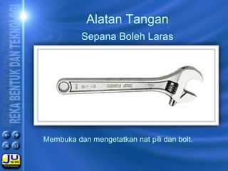 Sepana hujung terbuka o kegunaan untuk membuka kepala pili 4. KHB TING 1 - Bab 2 1 Faktor Reka Bentuk. Perengkuh paip o kengunaan untuk memegang batang paip bg ketika memasang atau membuka penyambung paip 2.
