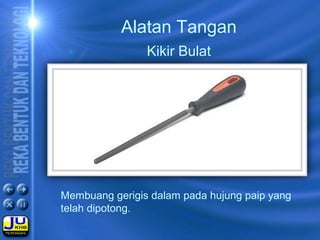 . Sesebuah bengkel atau mekanik persendirian perlulah memiliki alatan khas untuk melakukan kerja-kerja membaiki sesebuah kenderaan. Alat pembenang luar paip galvani -2 jenis iaitu alat yang menggunakan tangan dan alat yang menggunakan mesinyang dijalankan oleh kuasa elektrik. PENGENALAN Pada amnya alatan tangan dalam kerja kayu kerja bata dan kerja paip dapat dikelompokan kepada 11.